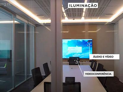 Con tecnologia de ponta, as salas permitem reuniões presenciais ou à distância de uma forma muito fluída e com alta qualidade de som e imagem.